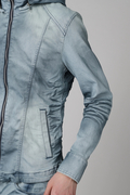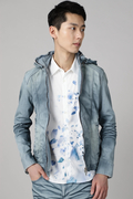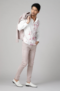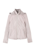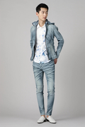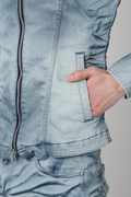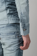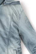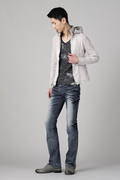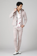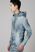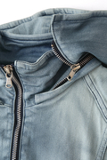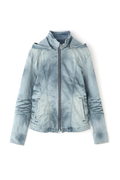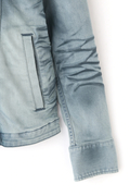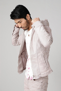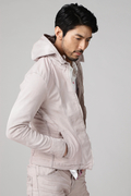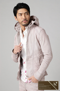 特殊ブリーチをベースに、グレイッシュベージュ、ピンクで染色することにより高級感のあるアウターに。立体ヒゲ部分には繊細かつ迫力のある陰影を出しています。