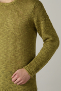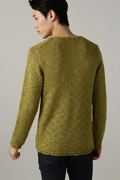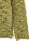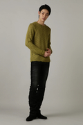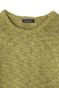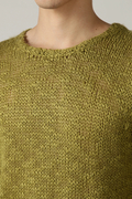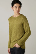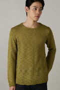 スラブ感のある太い糸で編まれたローゲージクルーネックニット。衿や袖口、裾を編みっぱなしにすることでカットオフのようなロックな雰囲気にしています。カラーはライトグレーとイエローグリーンなので、重くならずにアウターのインナーなどで、コーディネートのポイントになるアイテムです。