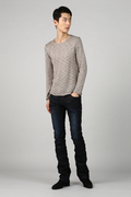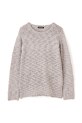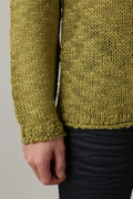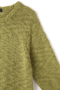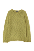 糸を甘く撚ることで太さに不均一さを出した、ローゲージニットです。太さを不均一にすることで、色の染まり方にもムラが出て奥行き感があります。カラーは明るいライトグレーとイエローグリーンなので、重たくならずにコーディネートのポイントになります。