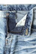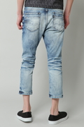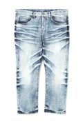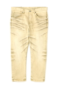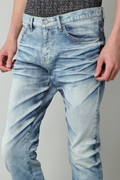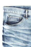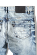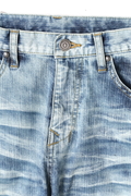 クラウド加工でブリーチし、さらに吹付け加工でシワに立体感を加工デニム。
