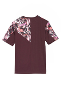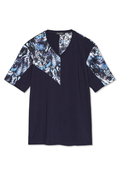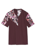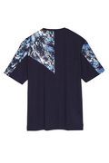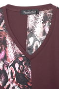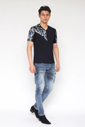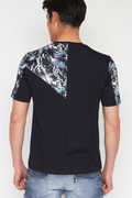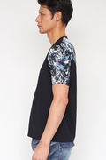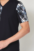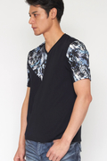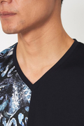 パイソンプリントのシャツ生地をアシメトリーにパネル切り替えしたVネックTシャツ。