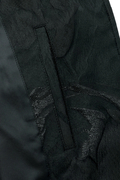 経糸にナイロンの極細モノフィラメント、緯糸に2色のポリエステル無撚糸とスリット糸を使用したジャカード素材で、複雑な織組織と糸の組み合わせで奥行きある氏が理となっています。
