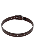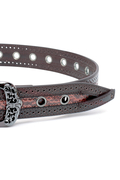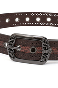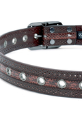 ヘビ革をパンチングを施したレザーで挟み込み、全体にハトメをあしらったフリーサイズ仕様のベルトに仕上げています。