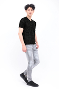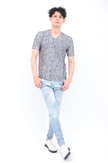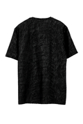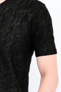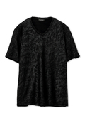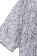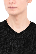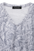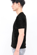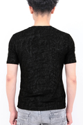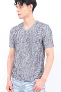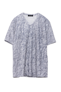 ウェーブタックジャージーにムラ柄フォイルプリントをのせたVネック半袖カットソー。