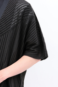 ストライプ柄を生かした素材使いと、ドルマンスリーブシルエットで、ゆったりとしたフォルムを形成。